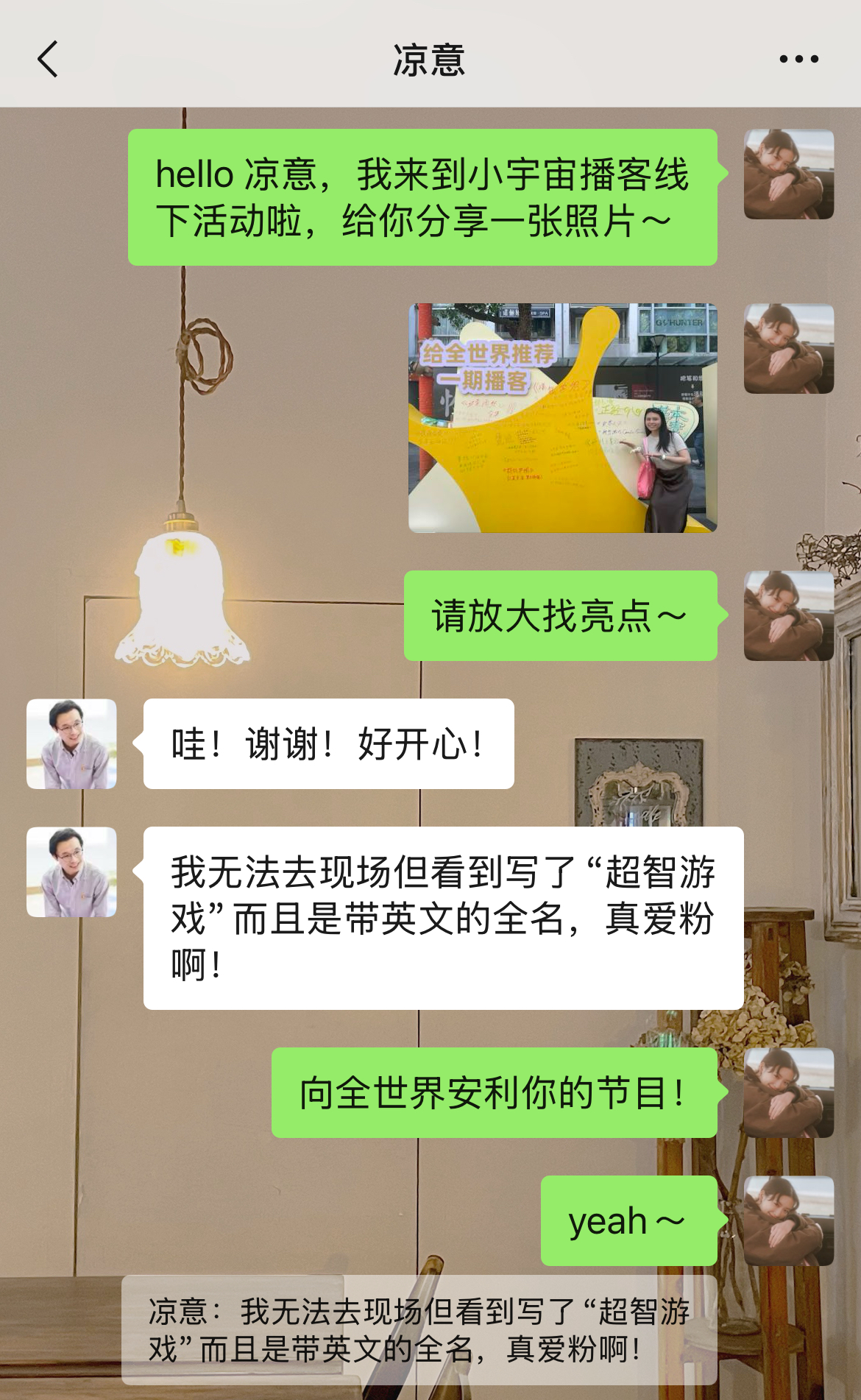 跟凉意分享后很快收到他的回复,非常开心!这就是播客存在的意义呀~