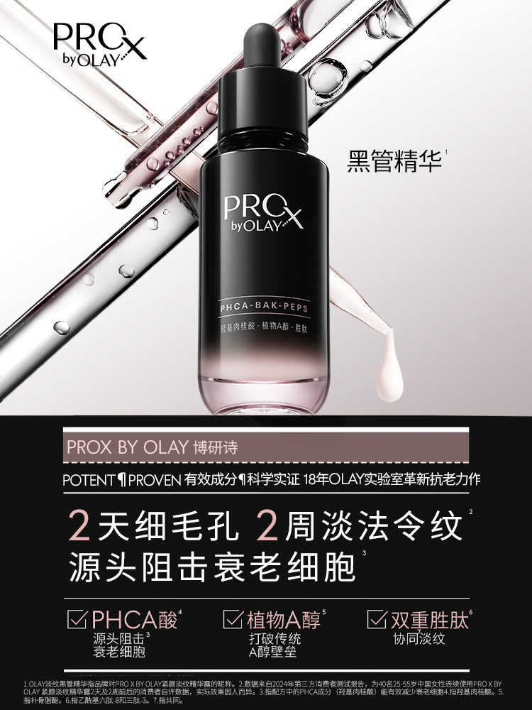 全新升级的 OLAY 黑管精华,运用突破性的「酸·A·肽」科技,集合 PHCA 酸、植物 A 醇、类肉毒肽 三重成分,做到真正的“对症淡纹”: