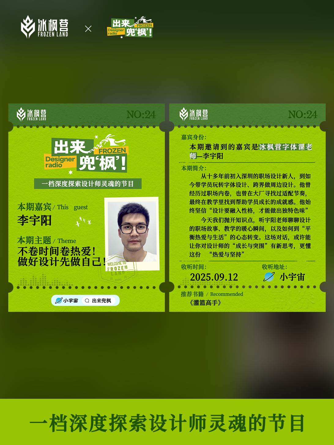 本期《出来兜枫》邀请到的嘉宾是大家熟悉的冰枫营字体课老师-宇阳老师 !从十多年前初到深圳的职场设计新人,到如今带学员玩转字体设计、跨界做周边设计的 “多面手”(下滑可看到宇阳老师设计的衣服展示哦)他曾历经职场内卷、大厂适配,最终在教学里找到 “助学员成长” 的成就感,并始终坚信 “设计要融入性格,才能做出独特色味”