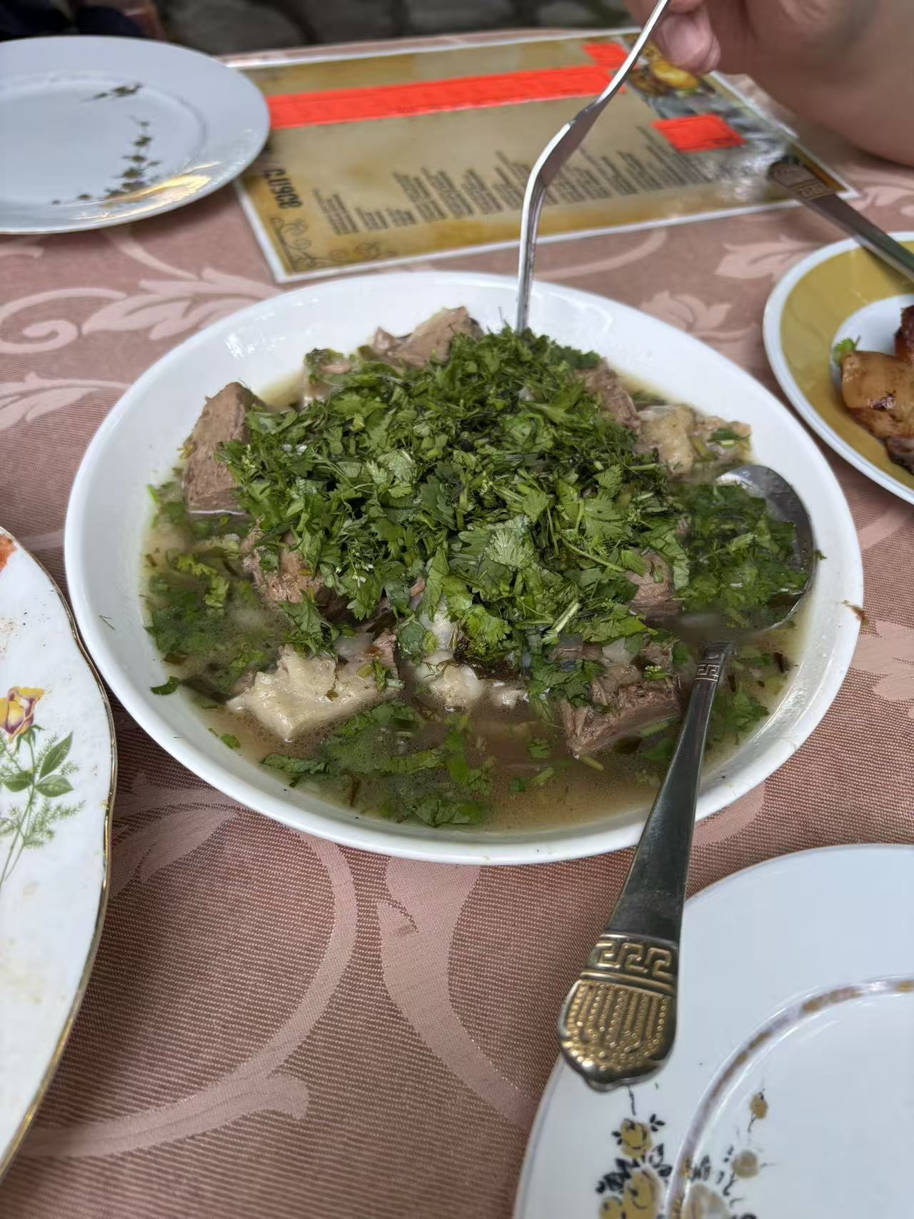 一道羊肉的才,上面满满都是香菜