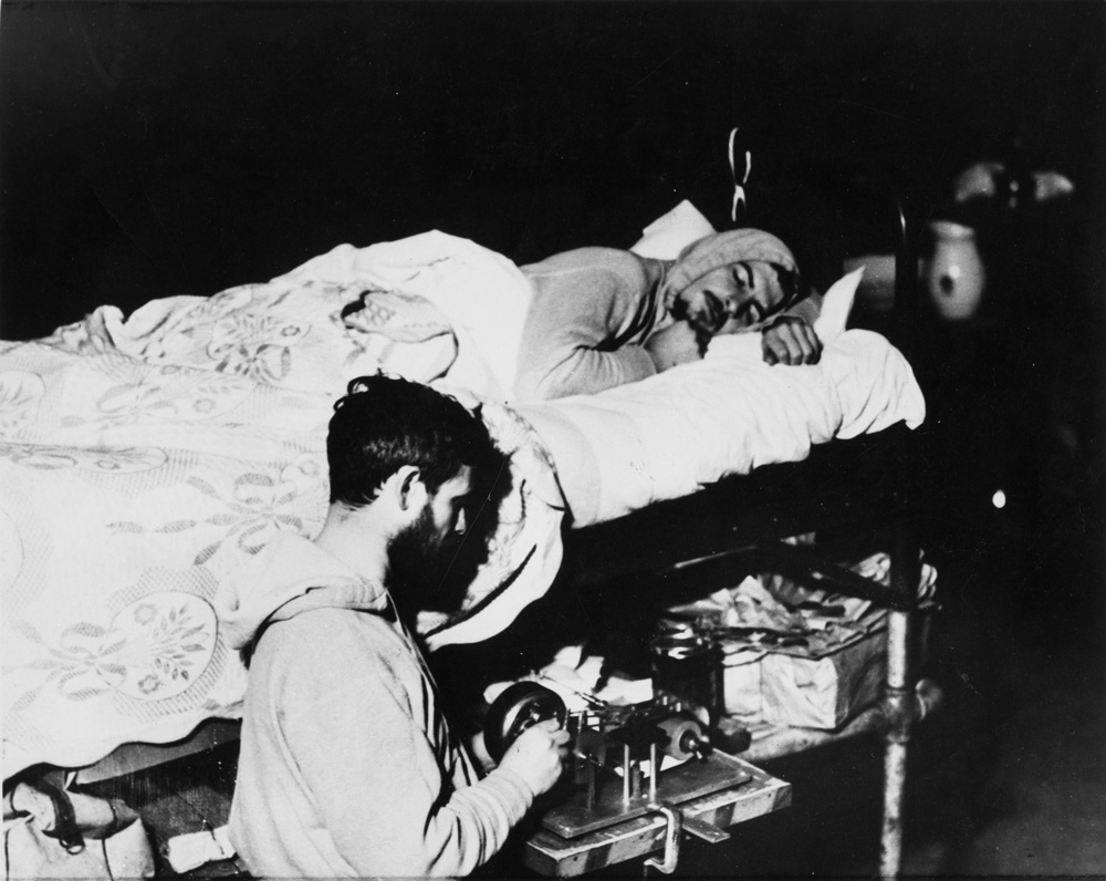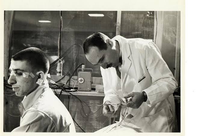 - 尤金·阿瑟林斯基 (Eugene Aserinsky): REM睡眠的发现者。下图中,Eugene Aserinsky(右侧)在给儿子Armond戴电极。