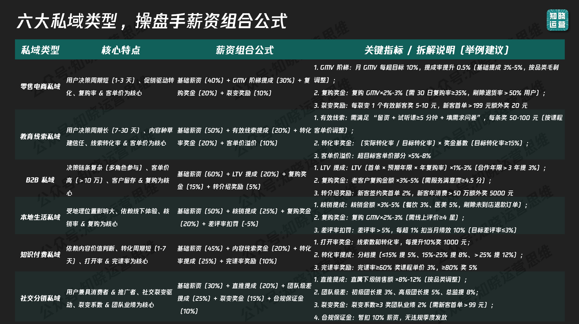 - 私域薪资里的底薪该怎么定、绩效要绑定哪些关键指标,以及 GMV 提成比例如何设定?