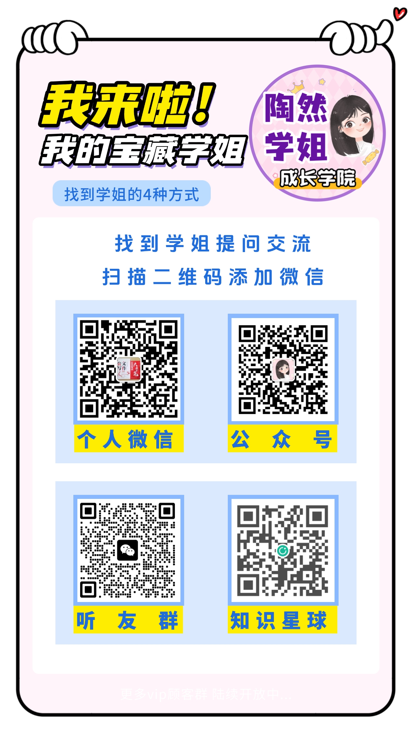 欢迎大家在微信公众号、b站、小红书搜索「陶然学姐」,也欢迎大家添加VX:taohua4499或下方扫码进入听友群,欢迎大家加入听友积极提问,今后我们也会定期制作听友答疑。