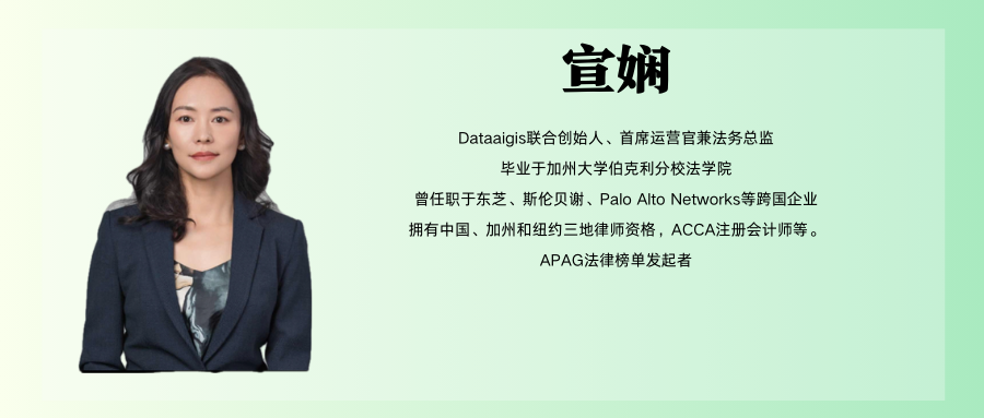 宣娴律师(Grace Xuan),Dataaigis联合创始人、首席运营官兼法务总监,拥有中国、加州和纽约三地律师资格,ACCA注册会计师。她曾任职于东芝、斯伦贝谢、Palo Alto Networks等跨国企业,深耕科技、能源、网络安全等多个行业,并最终跨界创业,打造专注于数据安全合规的科技企业。她发起APAG法律榜单,推动小众领域律师被更多市场看见。