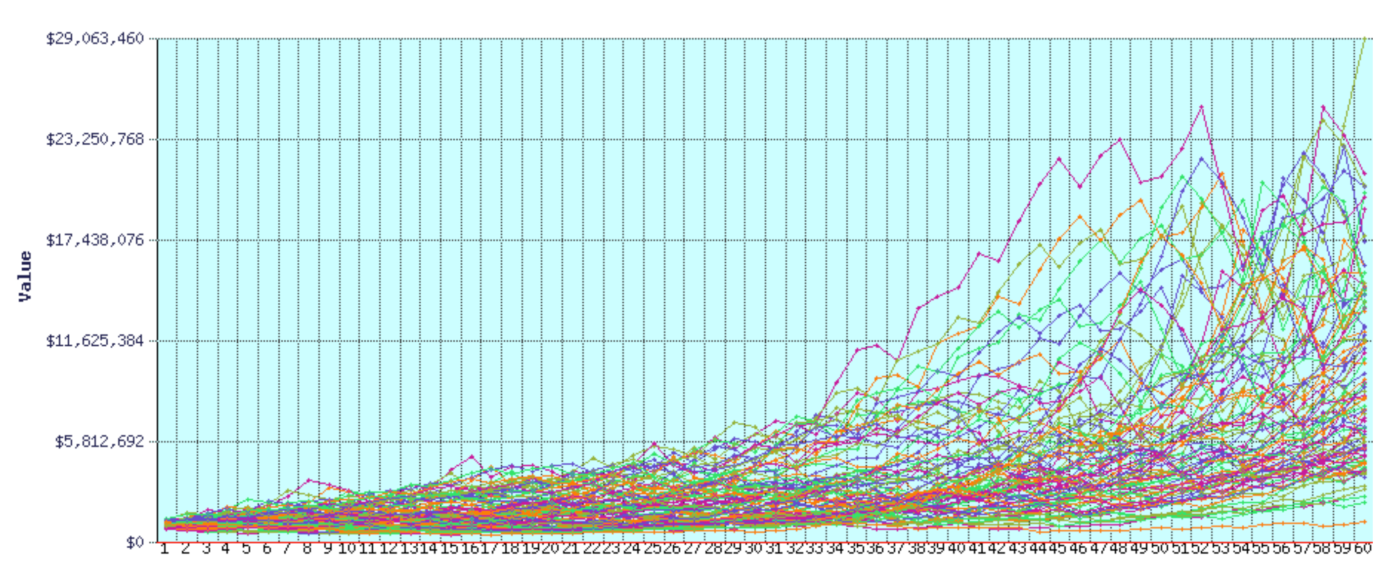 配图2:FIRE计算器 - 100万美金初始资产,每年提取3万美金,60年后投资组合最高竟然还能增长至2900万美金!