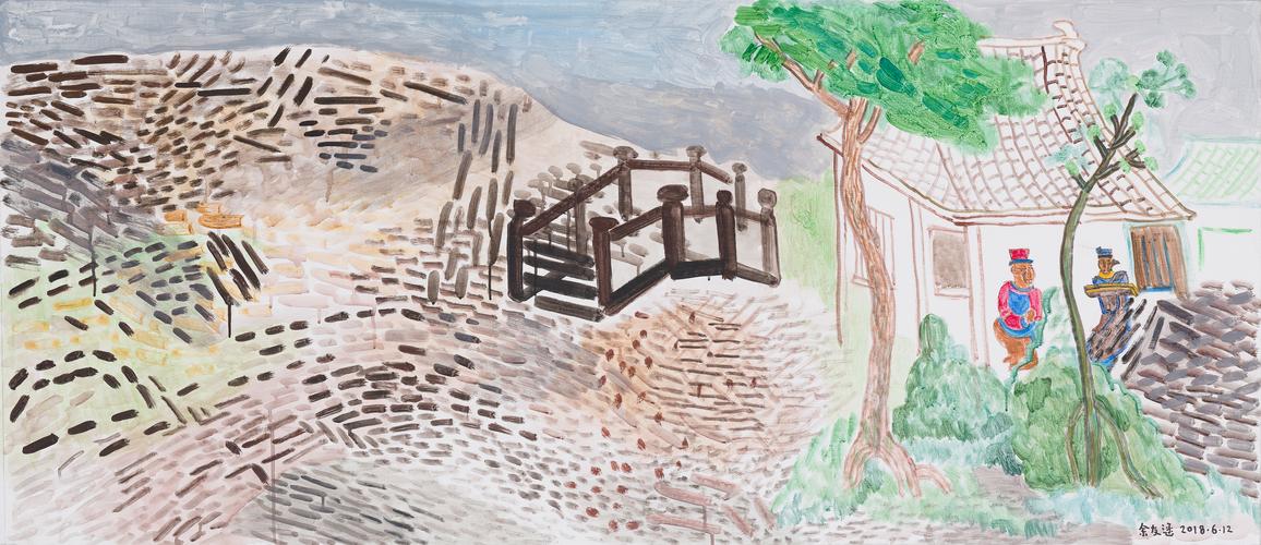 这些文字不仅探讨绘画的语言与形式,更延伸至艺术如何回应时代变迁,也体现了艺术家的广泛关怀与社会责任感。他关心东西方文化间的交流融合,比如2018年金正恩和川普在新加坡会面,余老师将两人“藏”于画中,创作了一幅作品。他更关心人、人类,这是他的天性,也表现在作品之中。