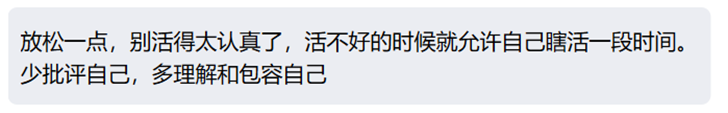 “ 我知道你最近一直很紧绷,因为你特别希望能够把这些事情做好,没关系,如果你想做好,可以继续这样去认真地做。但是如果你很累的时候,也可以让自己休息一下,然后再继续做。你可能那么多年都养成了批评自己的习惯,因为从小你都是被批评长大的现在你正在学习理解和包容自己。有的时候还是做不到,我们慢慢来。"