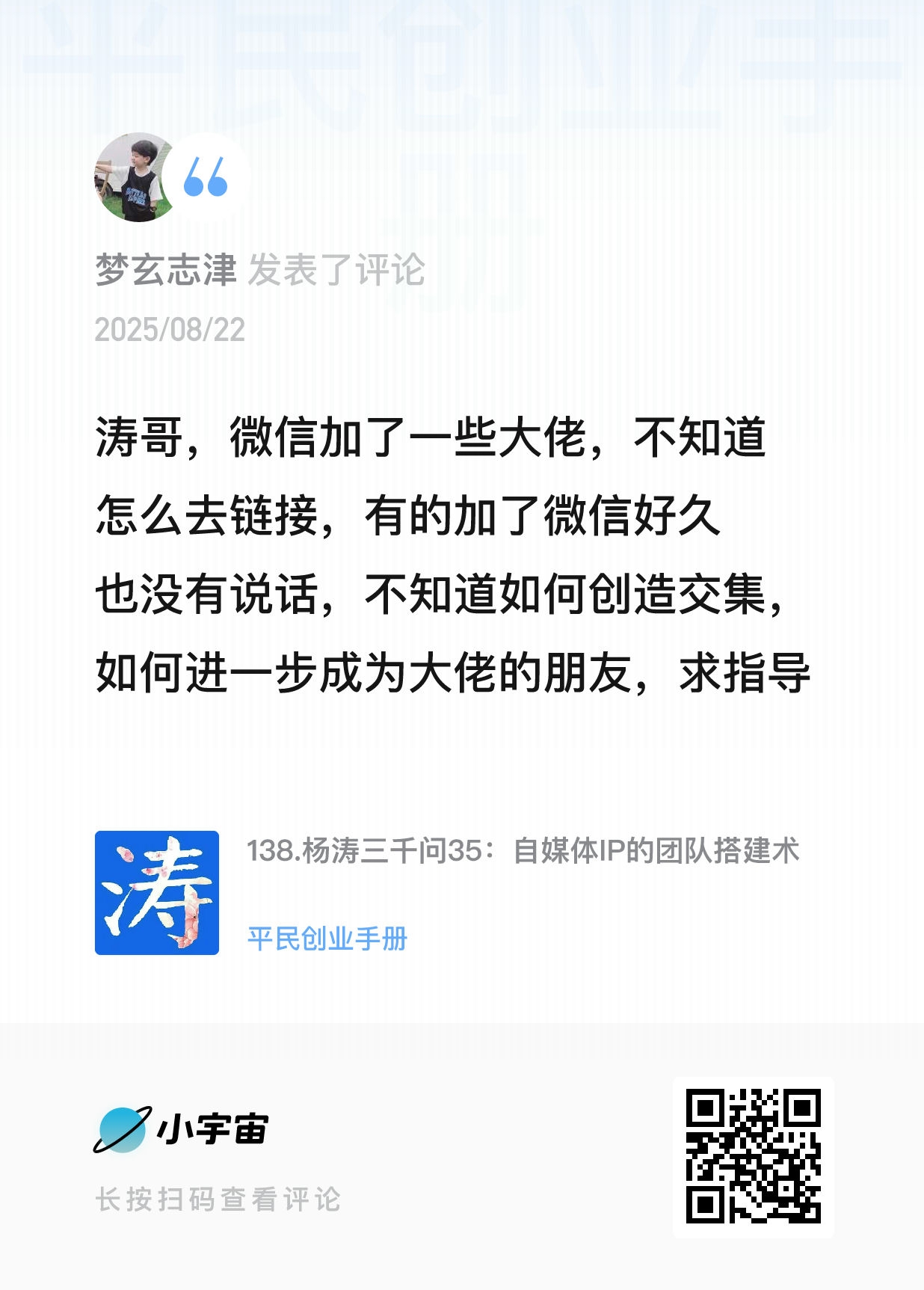 我的微信:xuejieyou6,欢迎撩我,我在「屋里涛说」等你,来星球《平民创业手册》有问必答,