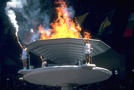 汉城奥运会的点火仪式:代表文艺、教育和体育的三名火炬手点燃,但也留下和平鸽被烤的悲剧
