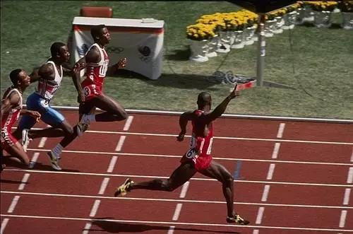 约翰逊在汉城奥运会男子100米决赛中冲过终点线