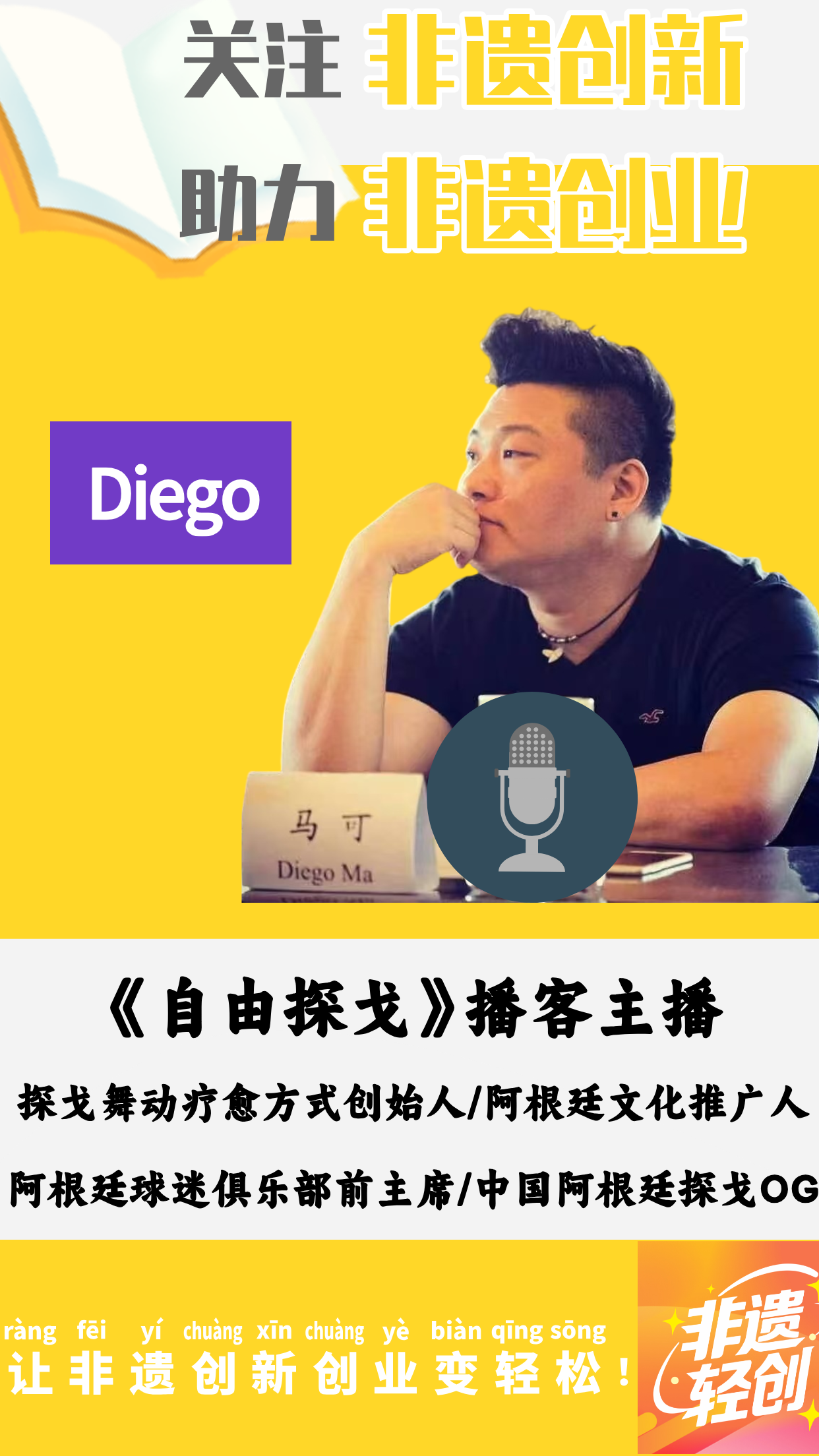 各位听友大家好,欢迎收听本期《非遗轻创》播客,我是主播真石。今天是一期特殊的播客串台节目,我将和《自由探戈》播客的主播diego老师一起聊聊关于探戈这项来自阿根廷的世界级非遗项目。其实我和diego老师是因为播客而结缘的,同为小众文化的垂类播客,我们想要聊得,不仅仅只是非遗文化的内容,更多的是想通过串台和观点交流让更多的小众且优秀的传统文化走进年轻人,探讨小众垂类文化播客的创新之道与未来发展。在正式节目开始之前,我想要好好为大家介绍一下diego老师的信息,他不仅在传播阿根廷文化领域有众多标签,比如探戈舞动疗愈方式创始人/阿根廷文化推广人,阿根廷球迷俱乐部前主席/中国阿根廷探戈行业OG;在播客领域,也是全球新人播客联盟和ILP播客联盟的创始人。
