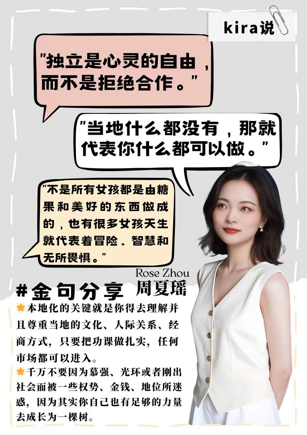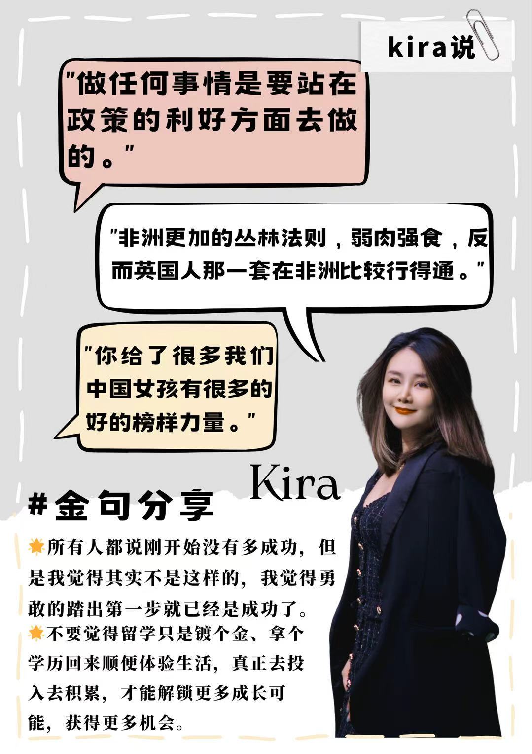 她的故事里,没有“一蹴而就”的神话,只有“付出全部努力再坦然接受结果”的坚韧;没有“单打独斗”的孤勇,只有“借势合作却保持心灵独立”的智慧。当很多人犹豫不前时,她早已带着对世界的好奇与热爱,在国际化浪潮中乘风破浪,每一次“敢想敢做”,都为人生铺就新的可能。