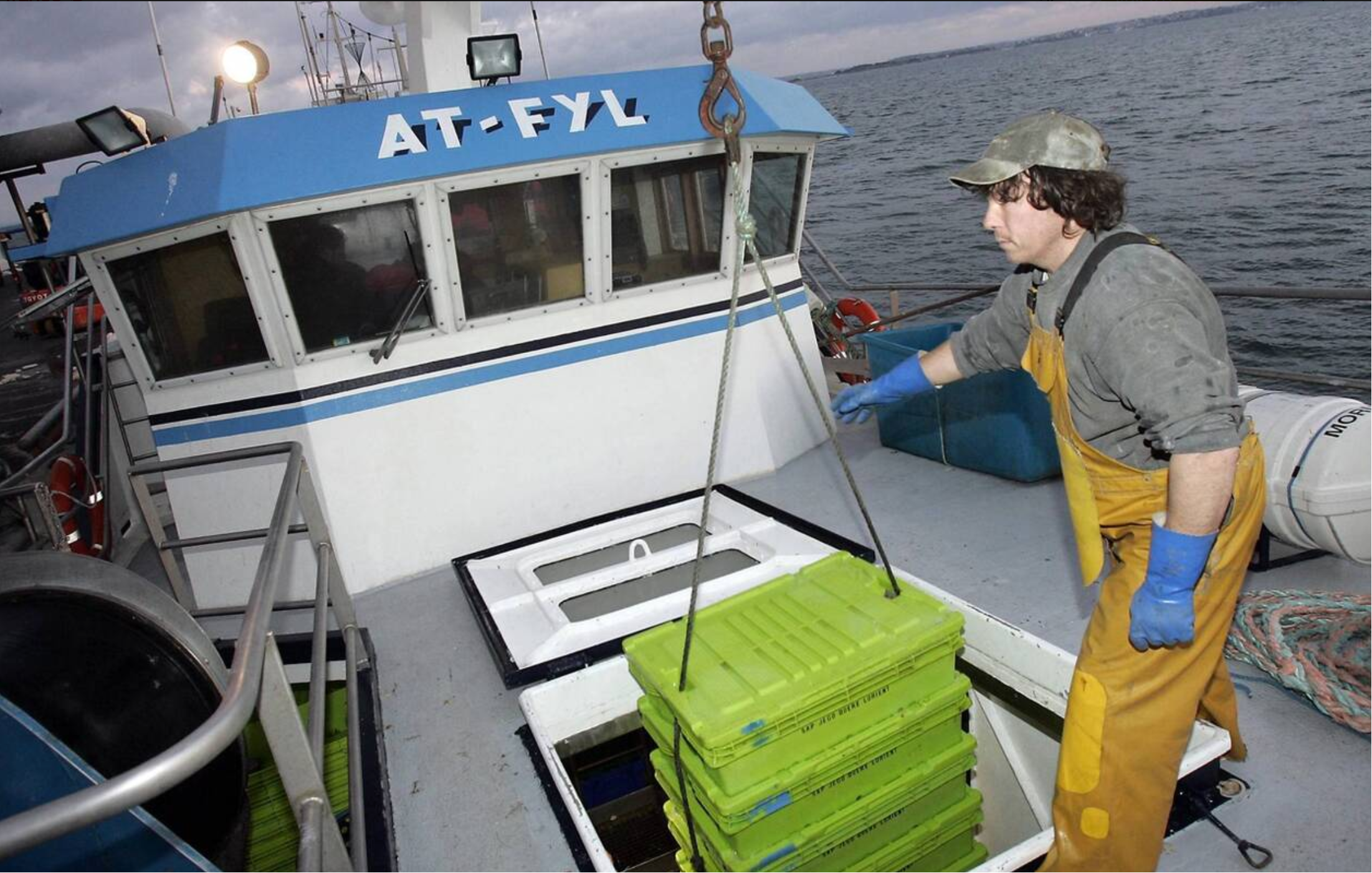 埃尔基拖网渔船“梅丽珊卓号”(Le Melisandre)在英吉利海峡的一次捕鱼之旅中,从拖网中打捞出一个绿色运动包,里面装着戈达尔博士的个人物品。“梅丽珊卓号”船长马蒂亚斯·鲁永(身穿白色T恤)展示打捞出的包。| 法国西部档案馆