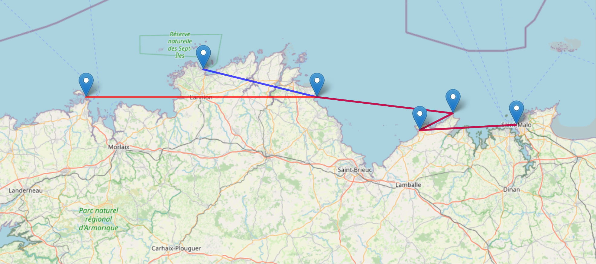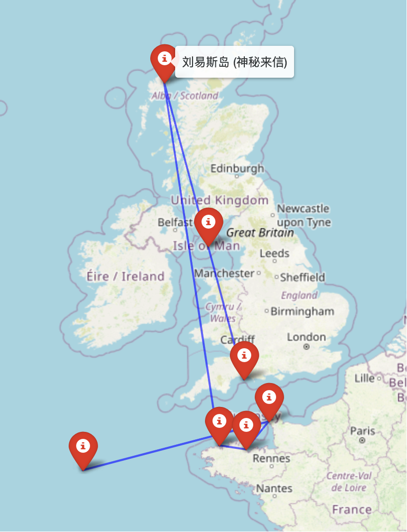 我在地图上绘制了两条路线,一条蓝色的路线,代表戈达尔原定的航线,一条红色的路线代表他实际的航线