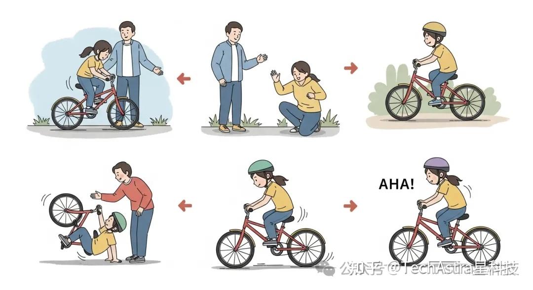回忆一下我们是如何学会骑自行车的:父母不会给我们讲解牛顿力学,而是让我们自己去尝试、去摔倒、去调整。我们会在一次次的尝试中逐渐“悟”出平衡的诀窍,骑得也越来越稳,这也就相当于机器学习算法的性能越来越提升。