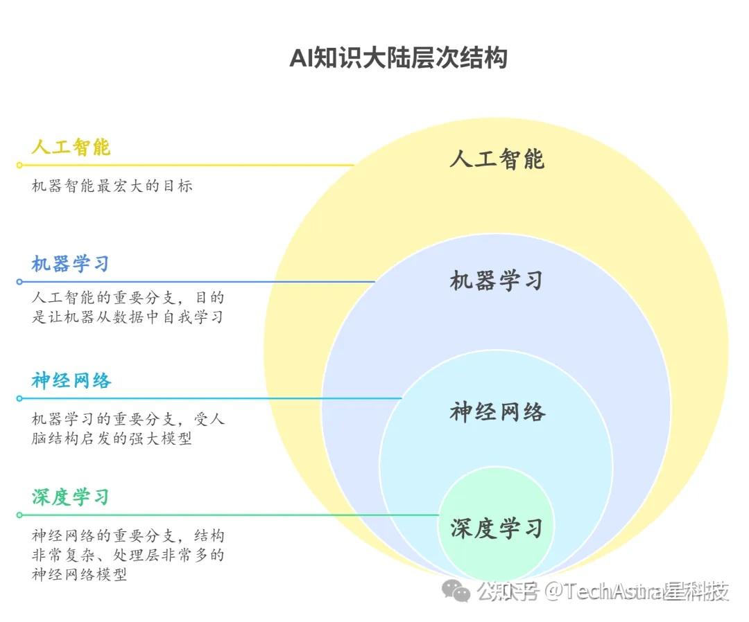 为了彻底搞清楚,我们就来看这张“AI知识大陆的层次结构图”。这可以说是我们探索AI世界最重要的一张地图图例。你看,这几个概念的关系就像一组“俄罗斯套娃”: