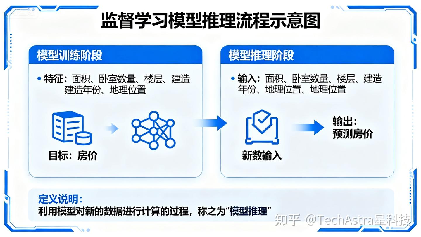 当遇到一个新房子时,你只需要输入它的特征(面积、卧室、位置等),机器就能利用学到的模型计算出一个预测价格,以供决策参考。这个利用模型对新数据进行计算的过程,我们称之为模型推理 (Model Inference)。