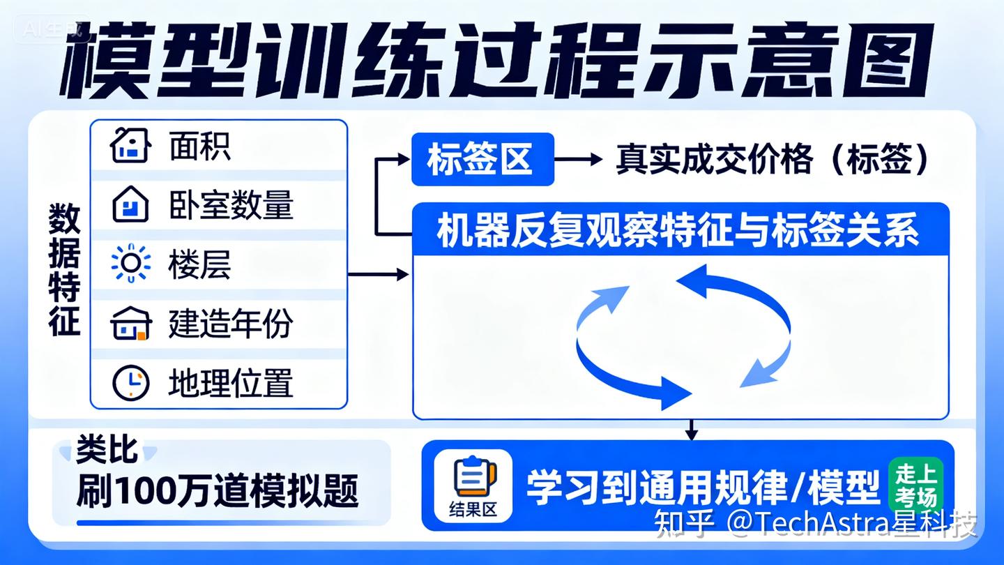 明确了任务、特征和标签后,机器如何学习呢?我们将历史上成交过的100万套房子的特征(面积、卧室、位置等)及其对应的标签(真实成交价)都喂给机器。机器会像一个勤奋的学生一样,反复观察这100万套房子的特征和标签之间的关系,最终学习到一个通用的规律或模型 (Model)。这个过程,我们称之为模型训练 (Model Training)。这就相当于刷完了100万道模拟题(训练完成)之后,就可以上考场了。