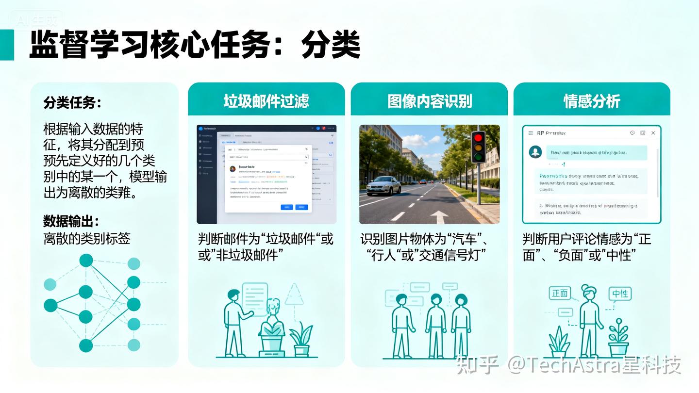 分类的目标是根据输入数据的特征,将其分配到预先定义好的几个类别中的某一个。模型的输出是一个离散的、表示类别的标签。