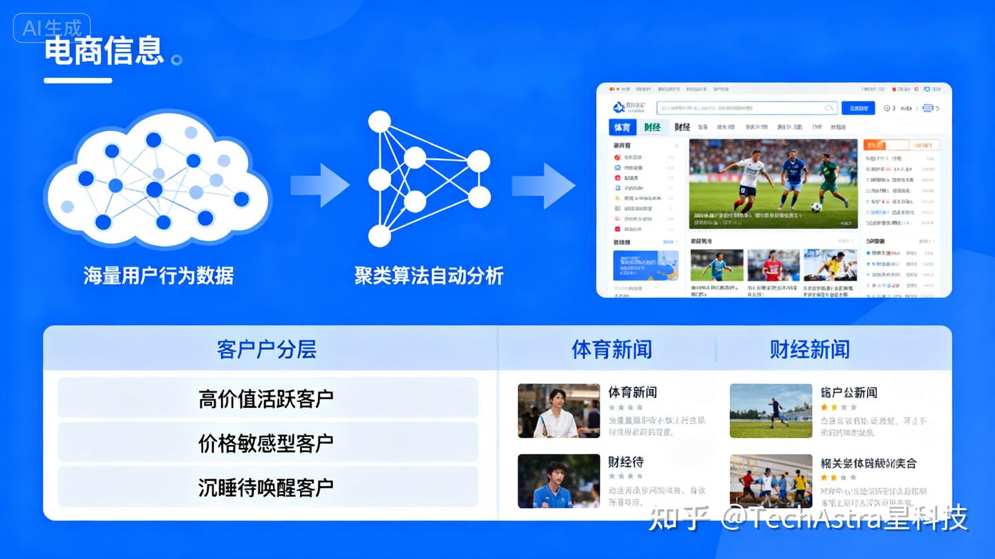 在这个过程中,我们不需要预先给任何一个用户打上标签,算法自己就能从数据中发现隐藏的客群结构。另一个例子是:新闻网站自动将相似内容的新闻聚合在一起,形成体育、财经等不同的话题频道。