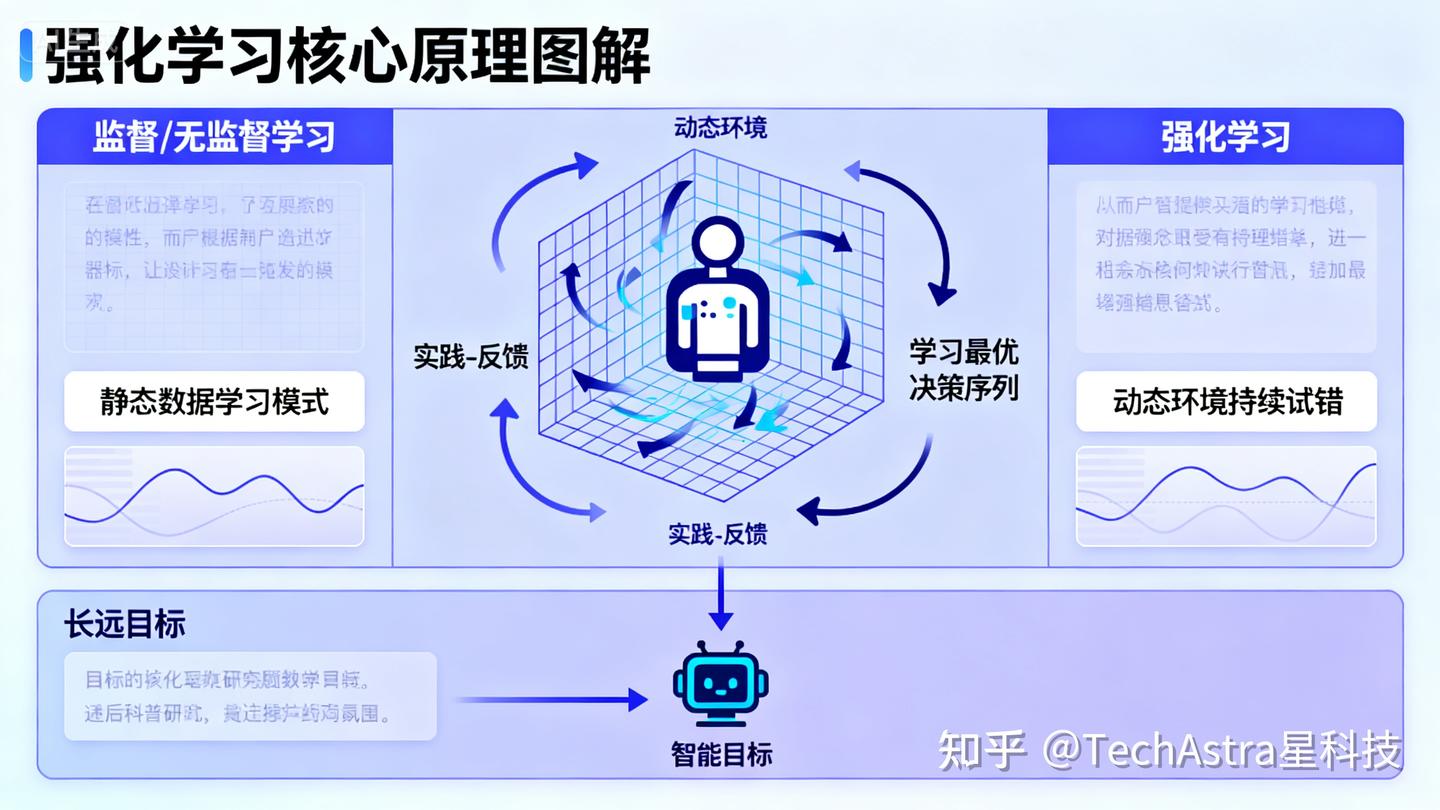 强化学习就像一位经验丰富的实战教练。它不直接教你固定的招式,而是为你设定一个目标,并明确奖励和惩罚机制,然后让你自己“下场”去领悟。