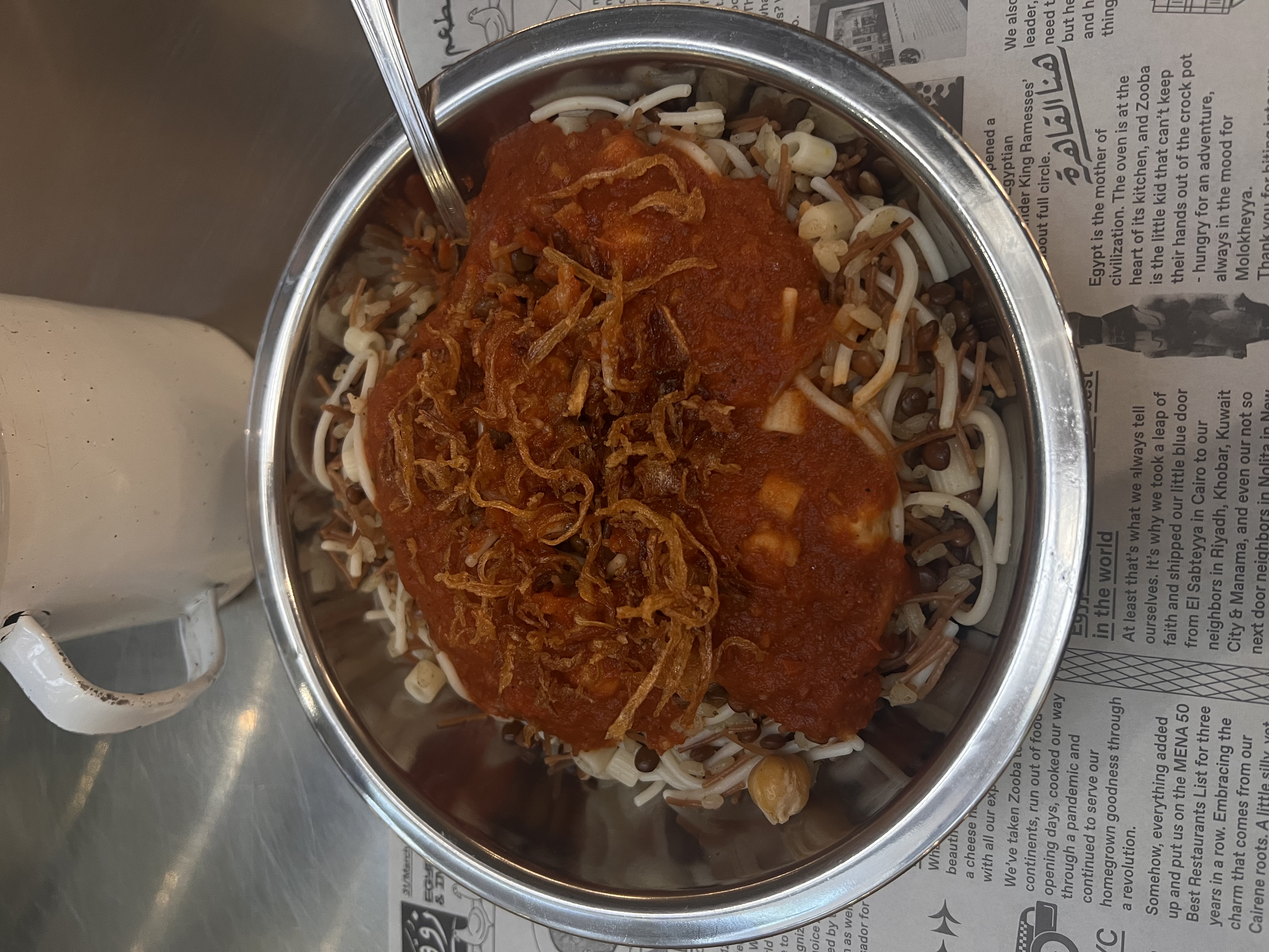 博物馆内开了号称中东50强餐厅的zooba分店,图为zooba出品的埃及国民小吃“库沙丽”,记不住名字就记“哭啥哩”
