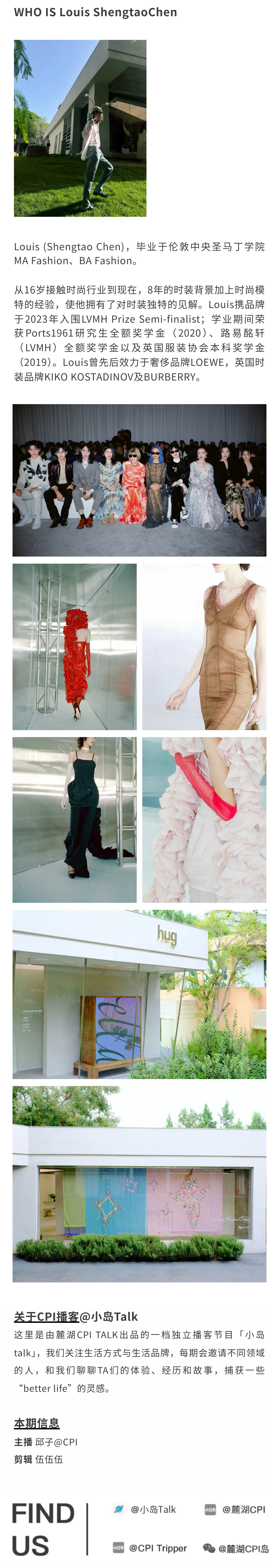 Louis ShengtaoChen是设计师Louis于2021年成⽴的同名⼥装品牌。品牌试图通过对服饰实验性的尝试,对传统奢华进⾏再定义,借由夸张⽽不设限的的配⾊与⾮常规⾯料组合,以精湛制⾐⼯艺作为媒介,汇以戏剧性和故事化的⼿法,构筑有趣的、触⼿可得的服饰哲学。