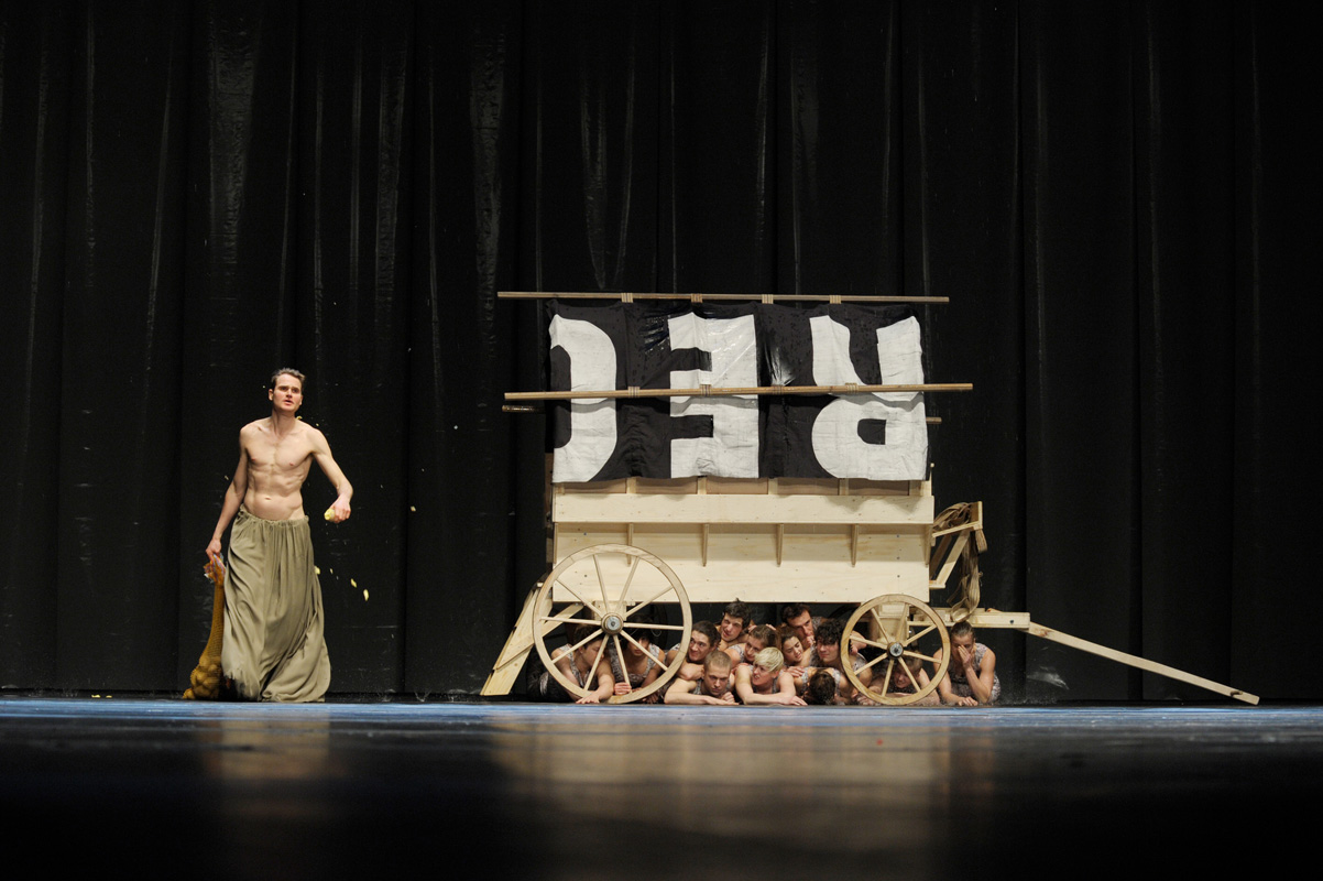 在第二个层面上,即视觉层面,经典的戏剧性引述拼接在一起,构成了一种对戏剧表现与革命努力的回顾。第三个层面上,波莱施直击我们排他的爱情欲望。第四个层面上,出色的法比安·欣里希斯在舞台上如同从吊杆系统上腾跃而下,敏捷地穿梭于论述之间,并从波莱施的剧作声调中激发出全新的音色。