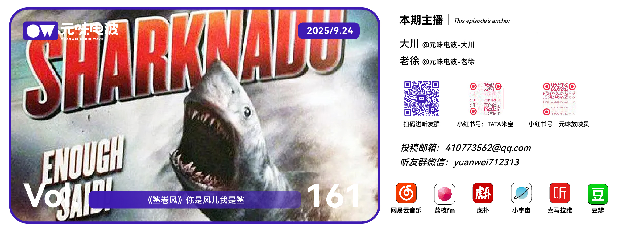 我们的节目,您可以在虎扑、小宇宙、喜马拉雅、网易云音乐、荔枝 FM、荔枝播客,苹果播客,豆瓣书影音,微博搜索「元味电波」来订阅、收听。如果喜欢我们,也可以分享给你身边的朋友!