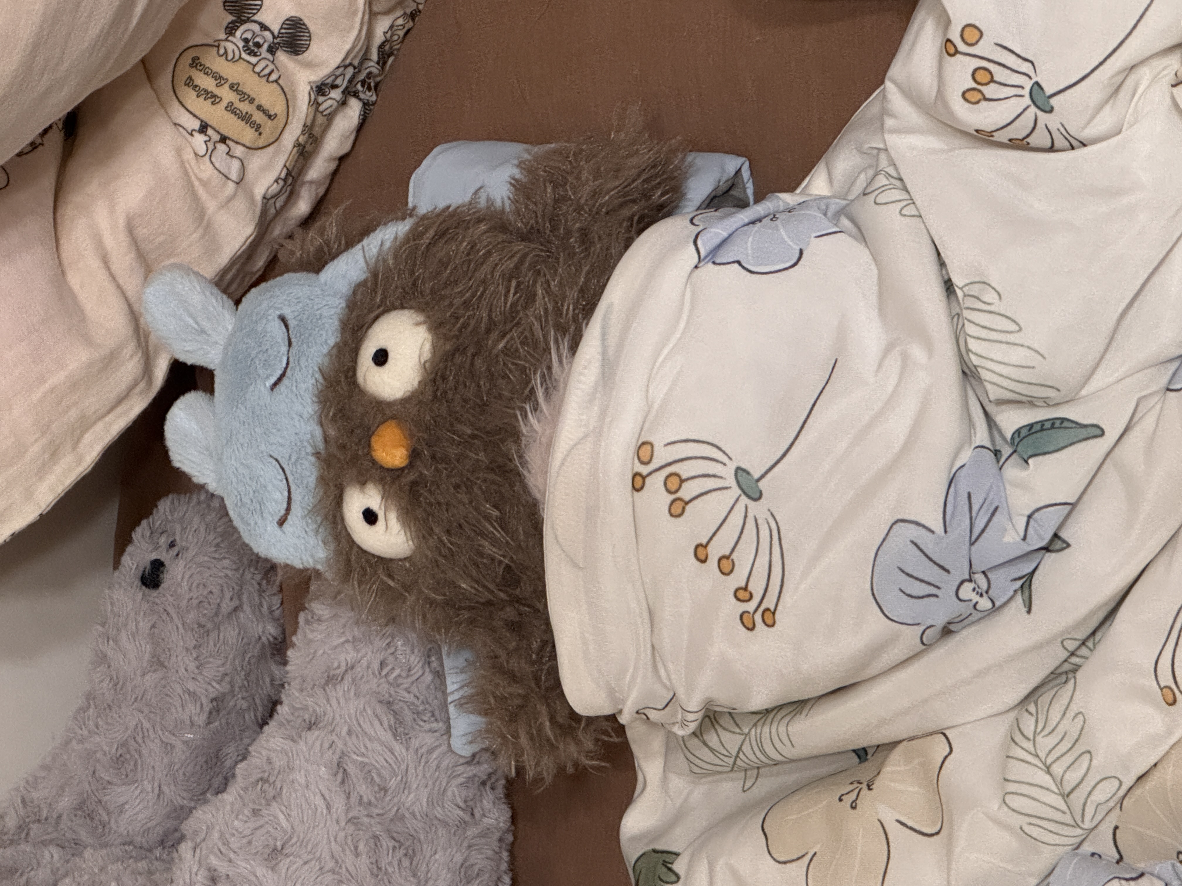 聊着聊着,万万给一个小玩偶盖上了被子~