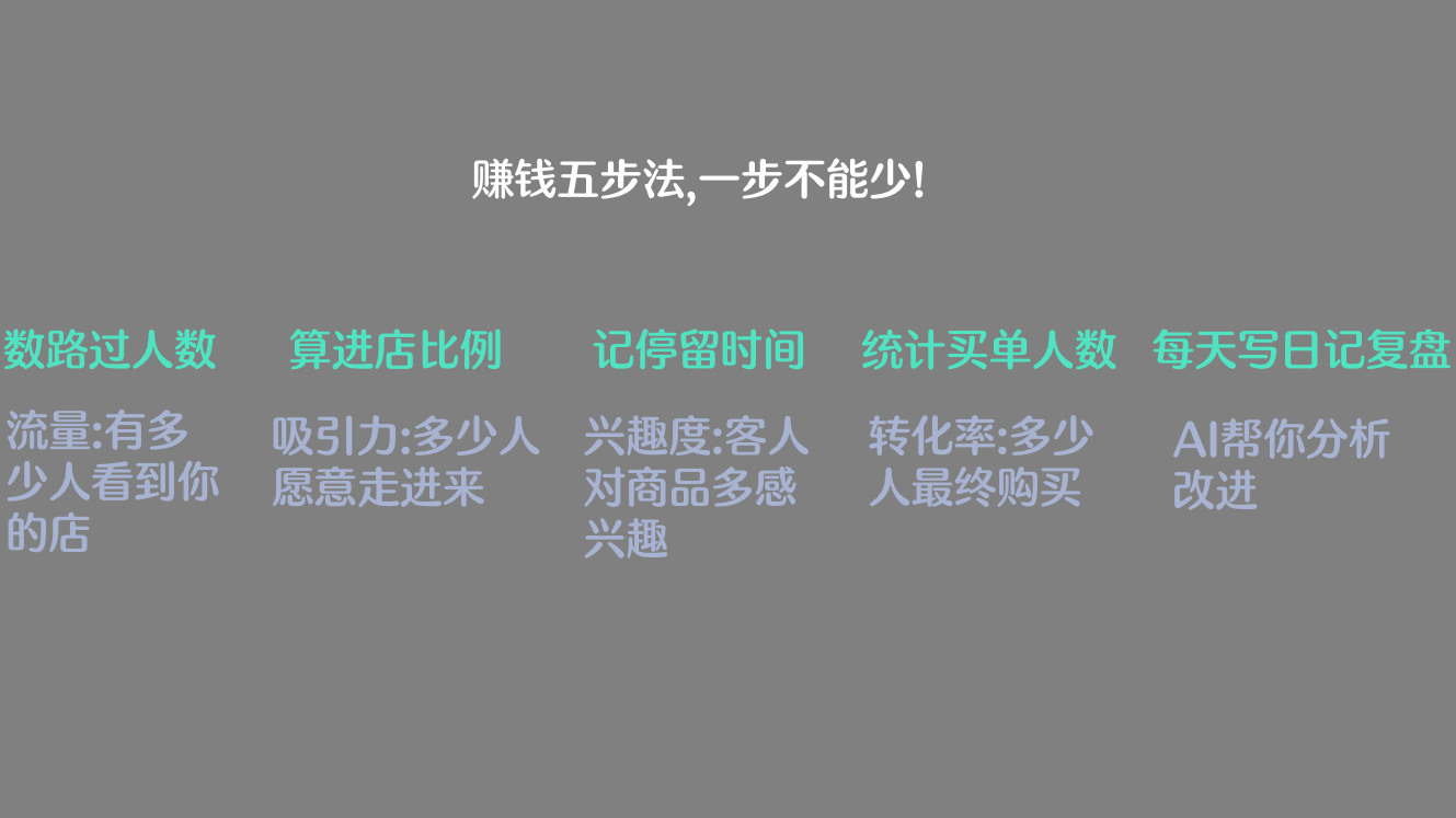【五步赚钱法】 路过人数→进店人数→感兴趣程度→购买转化→消费金额的完整销售漏斗分析。