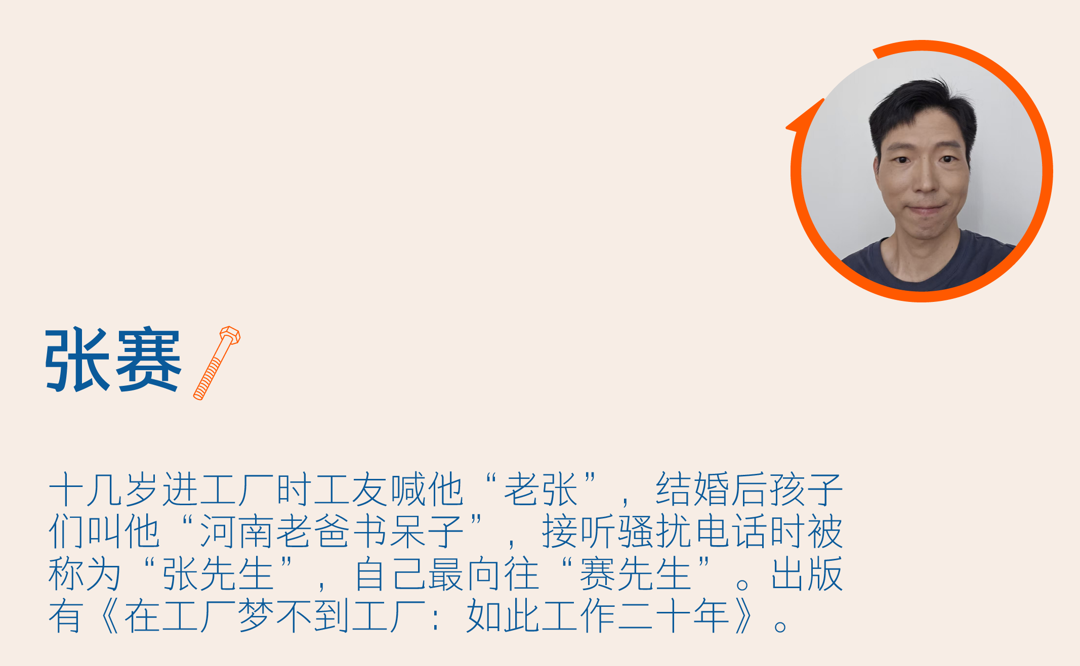 自 2003 年初中毕业,张赛已经工作了 22 年。人生中的大部分时间,他都待在工厂里,甚至一度停止了他曾经喜爱的读书和写作。直到 2020 年疫情期间,他又拿起笔记录,写作从一种兴趣爱好,变成生活的出口。在工厂的噪音与粉尘中,在十二小时制的工作里,他不断靠近更像自己的那一面——一个“书呆子”,一个愿意拿笔写下自己与工友的生活、写下机器轰鸣声中内心的呐喊的人。