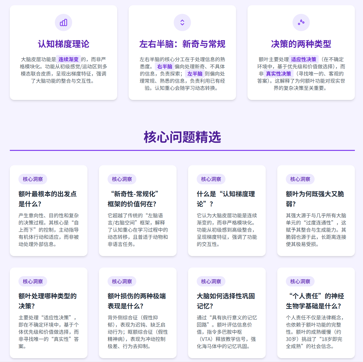 这部文献摘录主要探讨了额叶在人类认知、人格、决策和领导力中的核心作用,将其比作大脑的“首席执行官”。作者强调,人类大脑的进化体现在额叶的发育成熟上,该区域直到大约30岁才完全活跃,并且与大脑其他区域有着极其紧密的连接,使其对各种神经疾病尤其敏感。文本回顾了神经科学中关于大脑组织方式的争论,特别是模块化理论如何被更强调大规模并行、互联的梯度原则所取代,并指出这种转变与大脑自身的进化相呼吁。此外,书中深入探讨了额叶的执行功能、它在真实性决策与适应性决策中的不同参与,以及左右半脑的功能偏侧化如何影响学习、认知风格(如新奇性-常规化原则)乃至性别差异。最后,作者通过大量临床案例(如弗拉基米尔和凯文的额叶损伤)说明了额叶受损对心理灵活性、驱动力和社会行为造成的破坏性后果,并呼吁公众认识到人格和思维是大脑的产物,希望神经心理学能够通过认知向性药物和训练在治疗和预防认知衰退方面发挥更积极的作用。