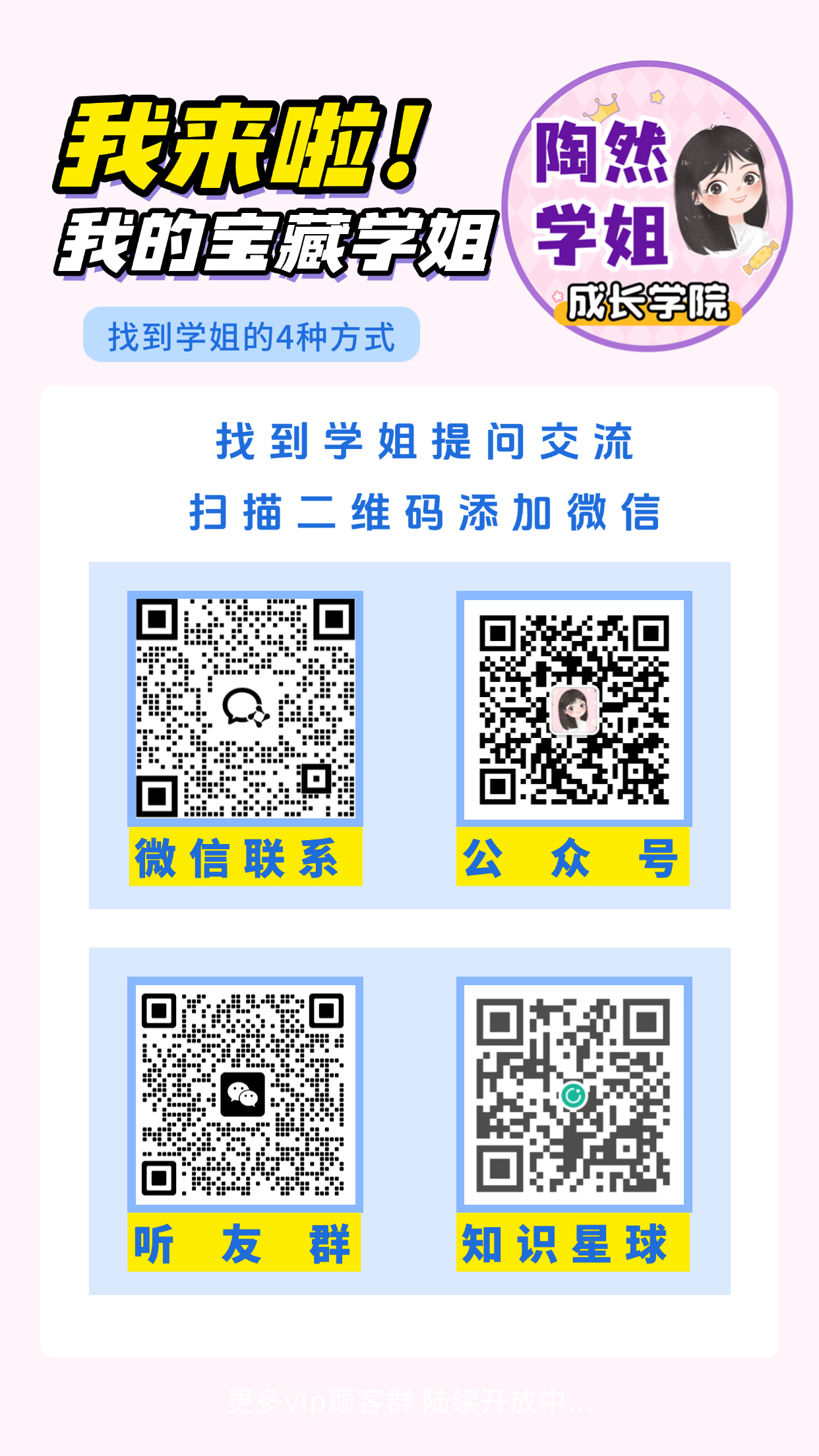 欢迎大家在微信公众号、b站、小红书搜索「陶然学姐」,也欢迎大家添加VX:taohua4499或下方扫码进入听友群,欢迎大家加入听友积极提问,今后我们也会定期制作听友答疑。