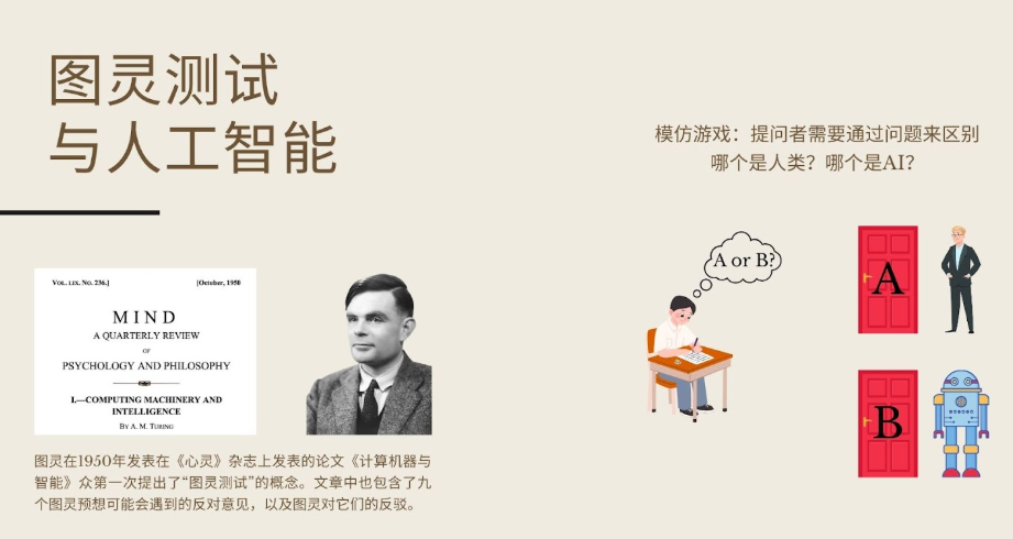 - 1950年,图灵在《心灵》杂志提出 图灵测试 概念(模仿游戏)。