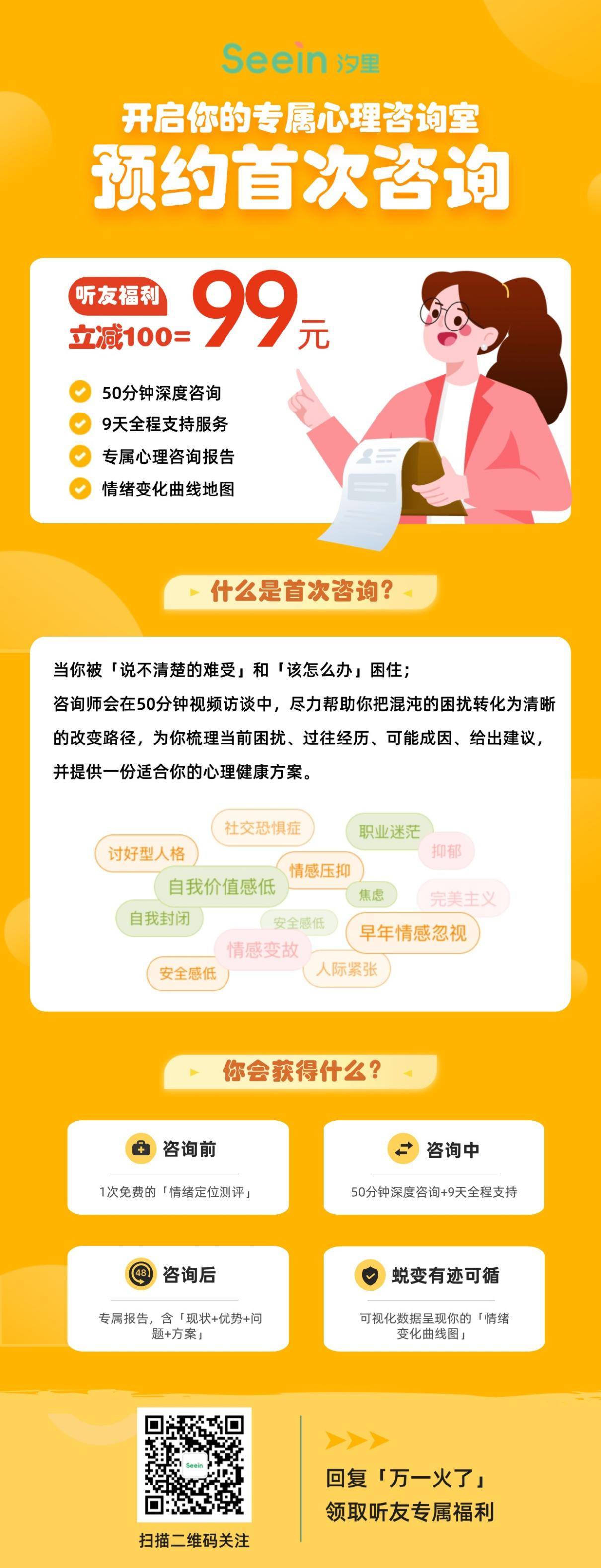 汐里心理的一对一首次咨询原价199元,现在特别为咱万火家人准备了专属福利 ——只要搜索并关注 「汐里心理」服务号,回复关键词【万一火了】,就能99元解锁首次咨询服务!