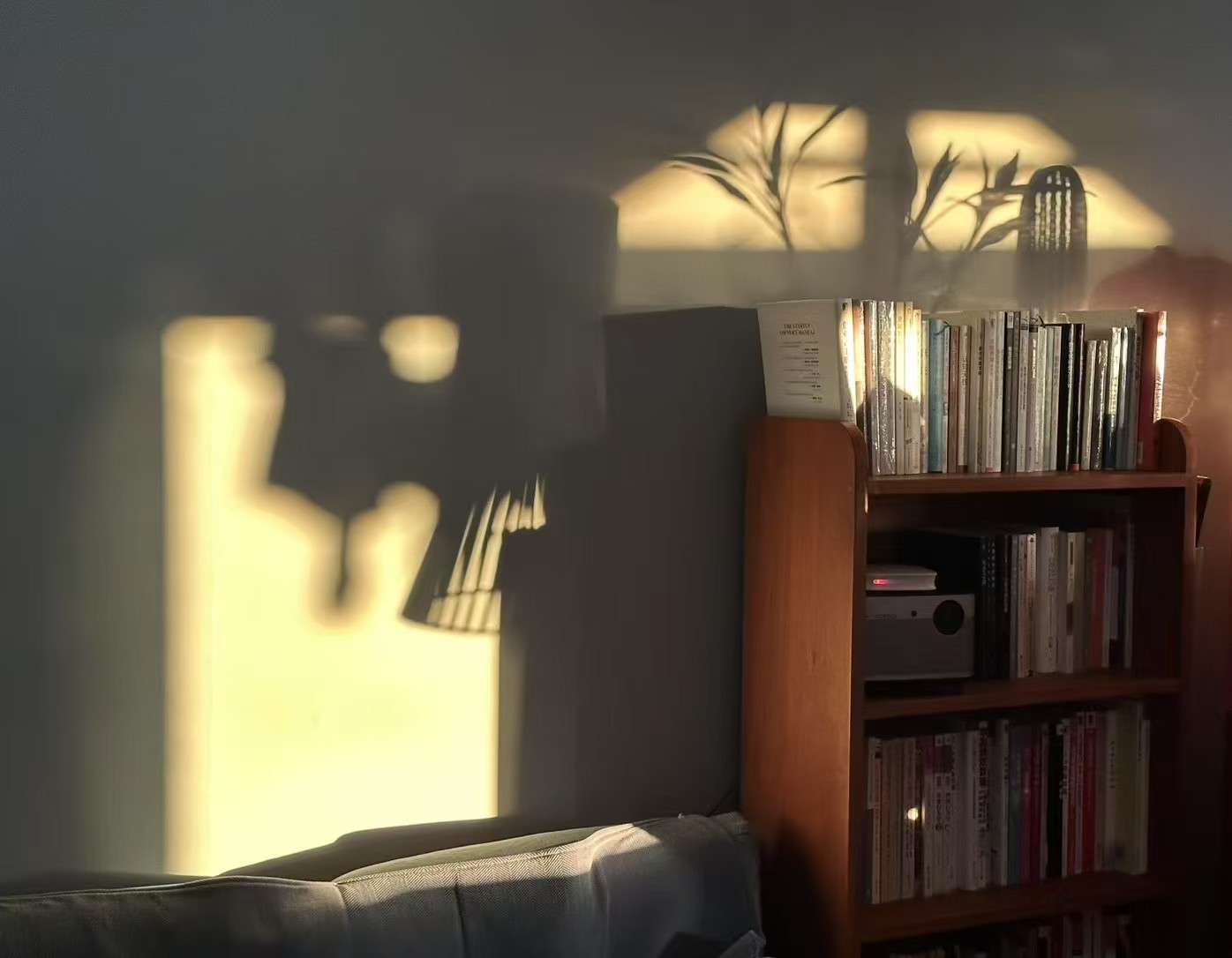 11:02 阳光的斜度刚好把落地灯倒影在墙上