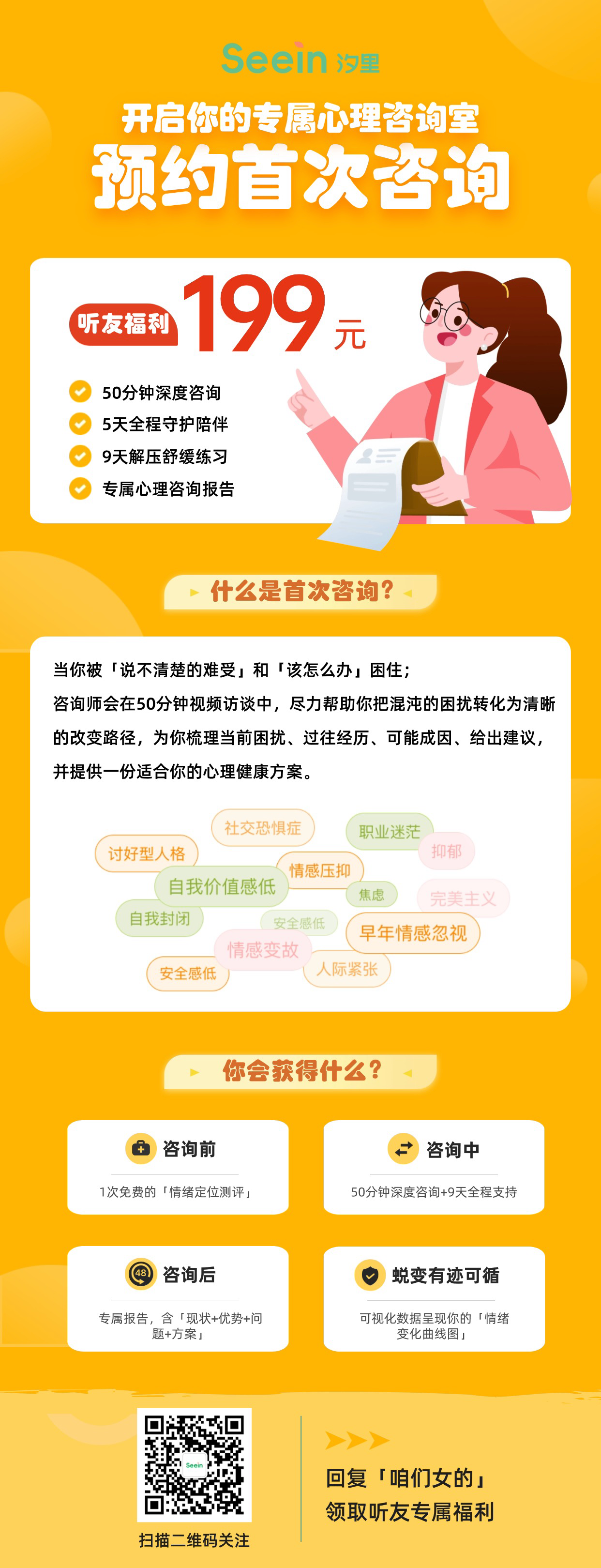 ✨🧧✨🧧在「汐里心理」服务号回复「咱们女的」领取专属优惠券,立享199元的首次咨询服务,额外赠送压力舒缓课程,欢迎体验!