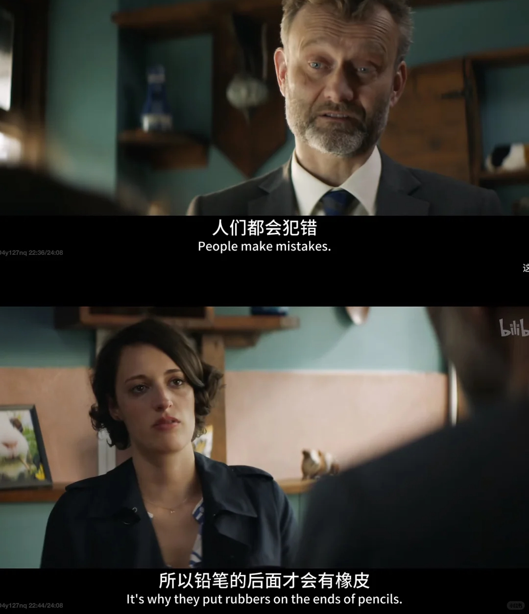 第二季开场第一句是“This is a love story”。 但第一季其实是一场关于“丧失与错误”的叙事。她失去了母亲,也间接害死了闺蜜 Boo。这种爱与愧疚叠加的痛,让她陷入混乱。剧中每个角色都在谈“mistake”——错误、后悔、补偿。这部剧在问一个极难的问题:当你亲手毁掉了所爱的人,当你背负着无法弥补的错误,你还要如何继续活下去?