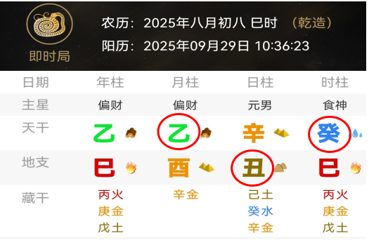 查出结果:月干乙 → 卯 → 大耗、日支丑 → 丑 → 官符、时干癸 → 子 → 六合