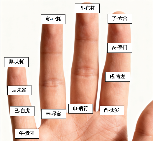 手掌装填:从“酉=太岁”开始,按顺序装填:酉=太岁,戌=青龙,亥=丧门,子=六合,丑=官符,寅=小耗,卯=大耗……