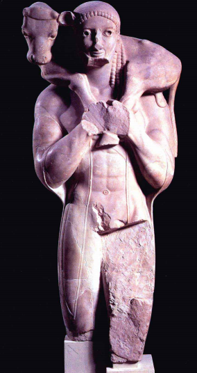 在古希腊古风时期之前,艺术是神的专属。雕像的表情,只能是神的威严、漠然,和永恒。但公元前6世纪,一件名为 《荷犊者》 的雕塑,却露出了一个“人”的微笑。