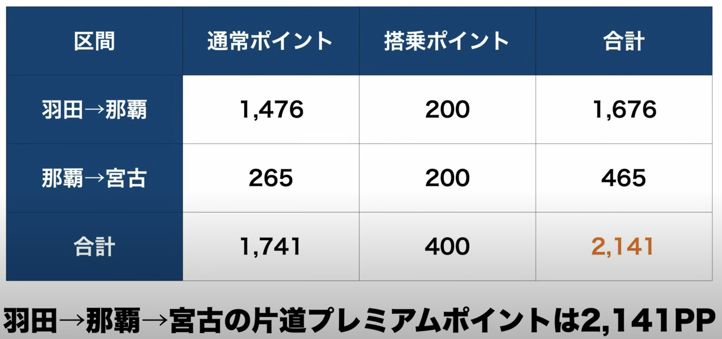 PP积分的计算例。羽田→那覇→宮古島的单程:2141PP,如果1天1个往返是4282PP,如果1天2个往返是8564PP。如果每次都这个路线,1天2个往返的话,只要坐6个集合(用6天=6个周末),2个月就修行成功了(5万PP)。