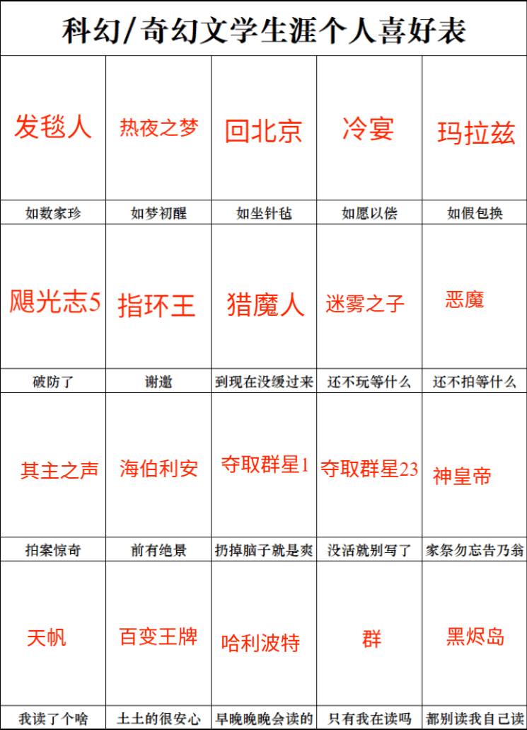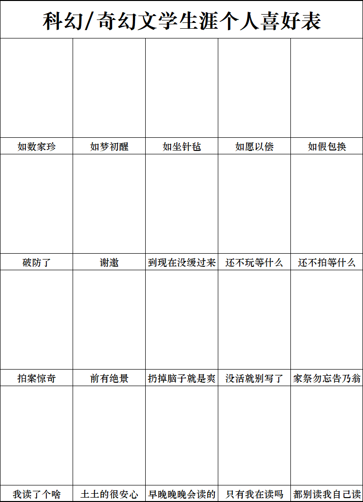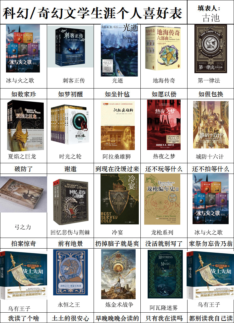而本期呢我们又要再次跳出三界宙,来整体性地谈谈作为奇幻读者都有过哪些独特的个人体验。首先向大家介绍下本期节目到场的两位嘉宾,他们都是拥有非常丰富的科幻、奇幻小说阅读体验的博闻者,也都是第一次来录制本节目的新嘉宾。第一位是相对较偏重科幻小说阅读的野斑马老师,第二位是相对较偏重奇幻小说阅读的古池老师,也请两位老师填写了下图的科奇幻阅读生涯表,对某一栏感兴趣的话可以直接索引时间轴进行跳转。