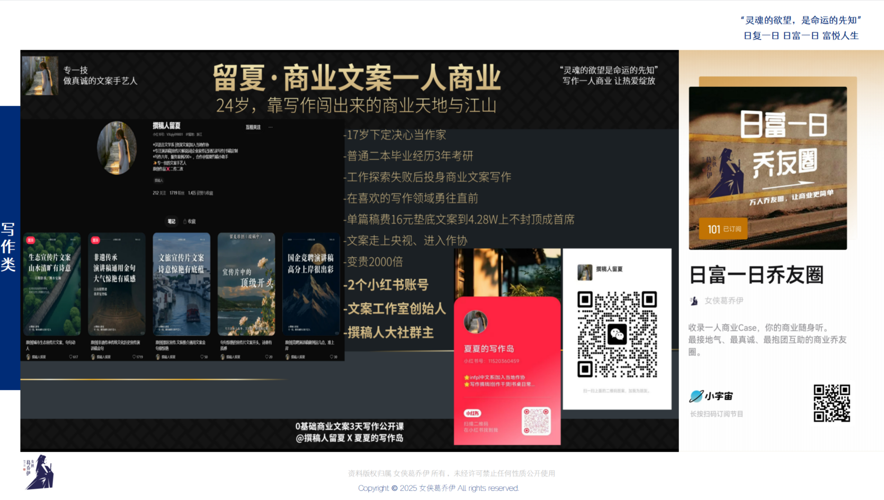 在今年唯一一次的《日富一日公开课》中,我们高密度、极简极实地分享:35岁一人创业的来时路、100个商业模式、多管道策略、百万爆品策略等生意脑、创业经,浓缩成几期播客分享给听友。