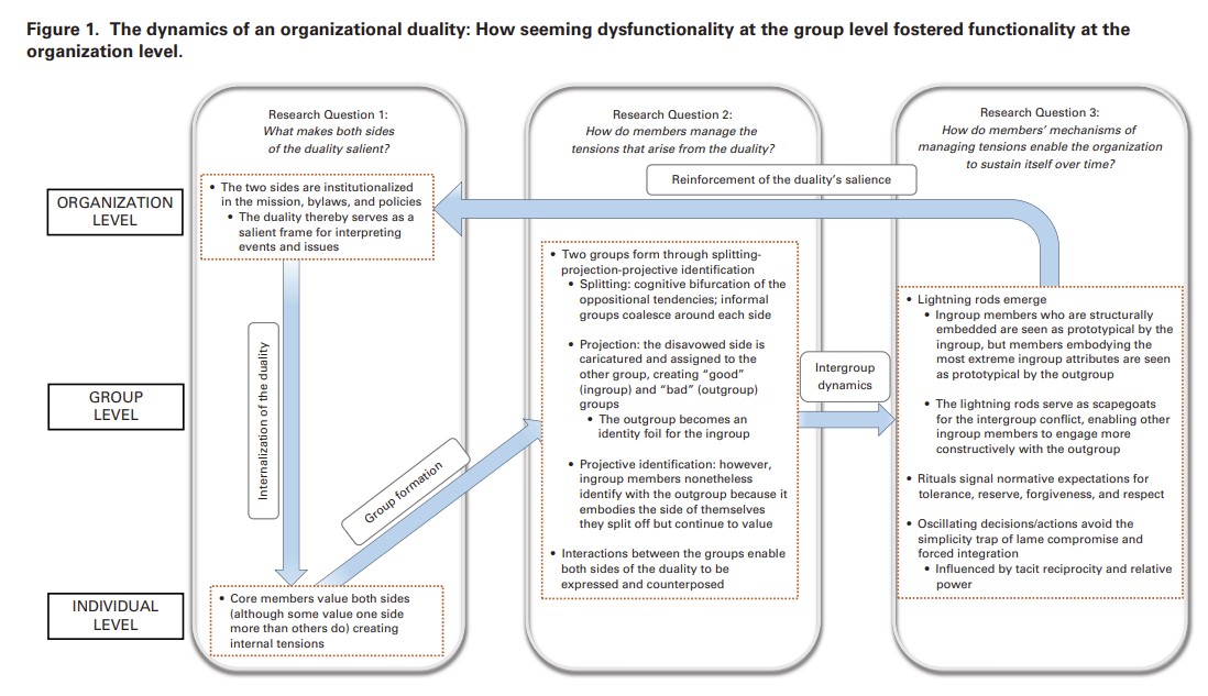 Ashforth, B. E., & Reingen, P. H. (2014). Functions of dysfunction: Managing the dynamics of an organizational duality in a natural food cooperative. Administrative Science Quarterly, 59(3), 474–516. doi.org