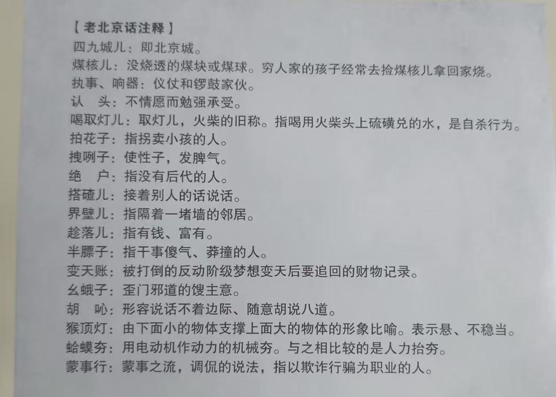 18:10 北京话词汇:铁瓷(关系好)、甭介(不要)、捎带手(顺便)、捅娄子(犯错误)、您、取灯儿/起灯儿(火柴)、点卯(没事儿但得去一下)、熬鹰(熬夜)、拿大顶(倒立)、我自个儿(我自己)、炸了庙了(很乱)