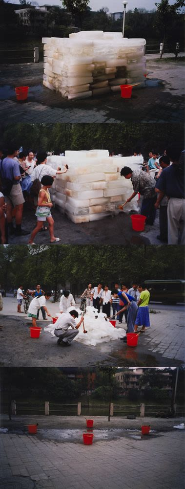 - 挖掘宝藏尹秀珍:中国女性艺术家,她触及的社会议题很多。本次展览中的作品1995年的《洗河》就跟环保有关,很容易让人联想到不久前在环保上翻车的《升龙》。也让人值得反思,虽然激浪派说万事皆可艺术,但是不是艺术真的完全没有边界?1995年夏天,她参与艺术节过程中,以唐代诗人刘禹锡歌颂的府南河,在当时遭受了严重污染为母题。抽取这条沦为全国污染最严重的水系之一的河水制作成10立方米的大冰块,邀请路人洗刷冰块。最后冰块消融,只留下了四张照片。