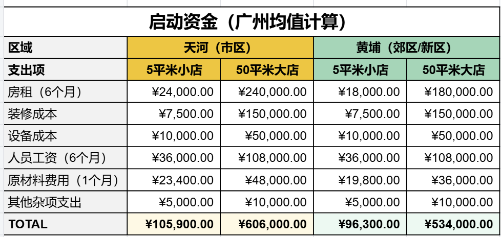 这个就简单计算,假定在广州的奶茶店用人成本,1个全职人员,算上社保等杂项要6K。5平米小店,新招1人,也就是每月6K;50平米大店,新招3人,也就是每月18K。这个我们往低的算,然后也不算上自己的工资。