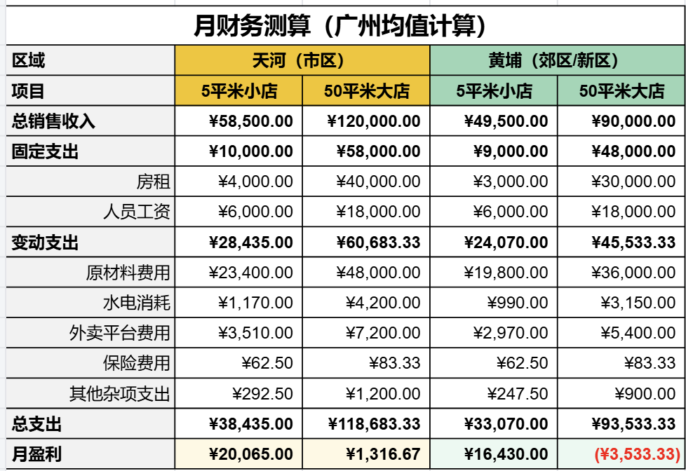 50平米大店客单价在20元(有一些溢价),然后原料占比也是40%,大概8元。